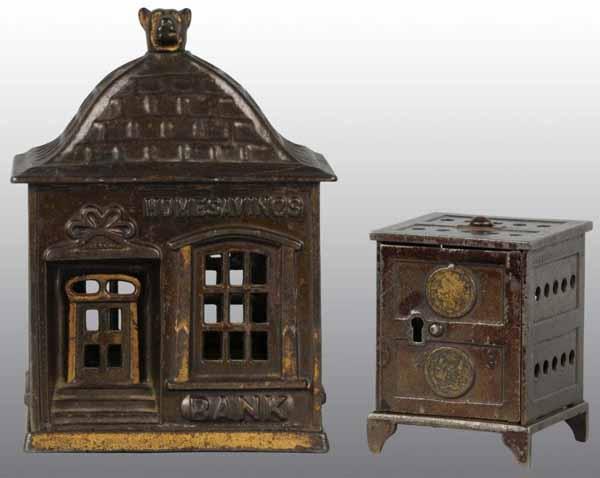 Description Includes one Home Savings bank manufactured by J. & E. Stevens and Company and one small safe bank with coins on side. Condition (Excellent).