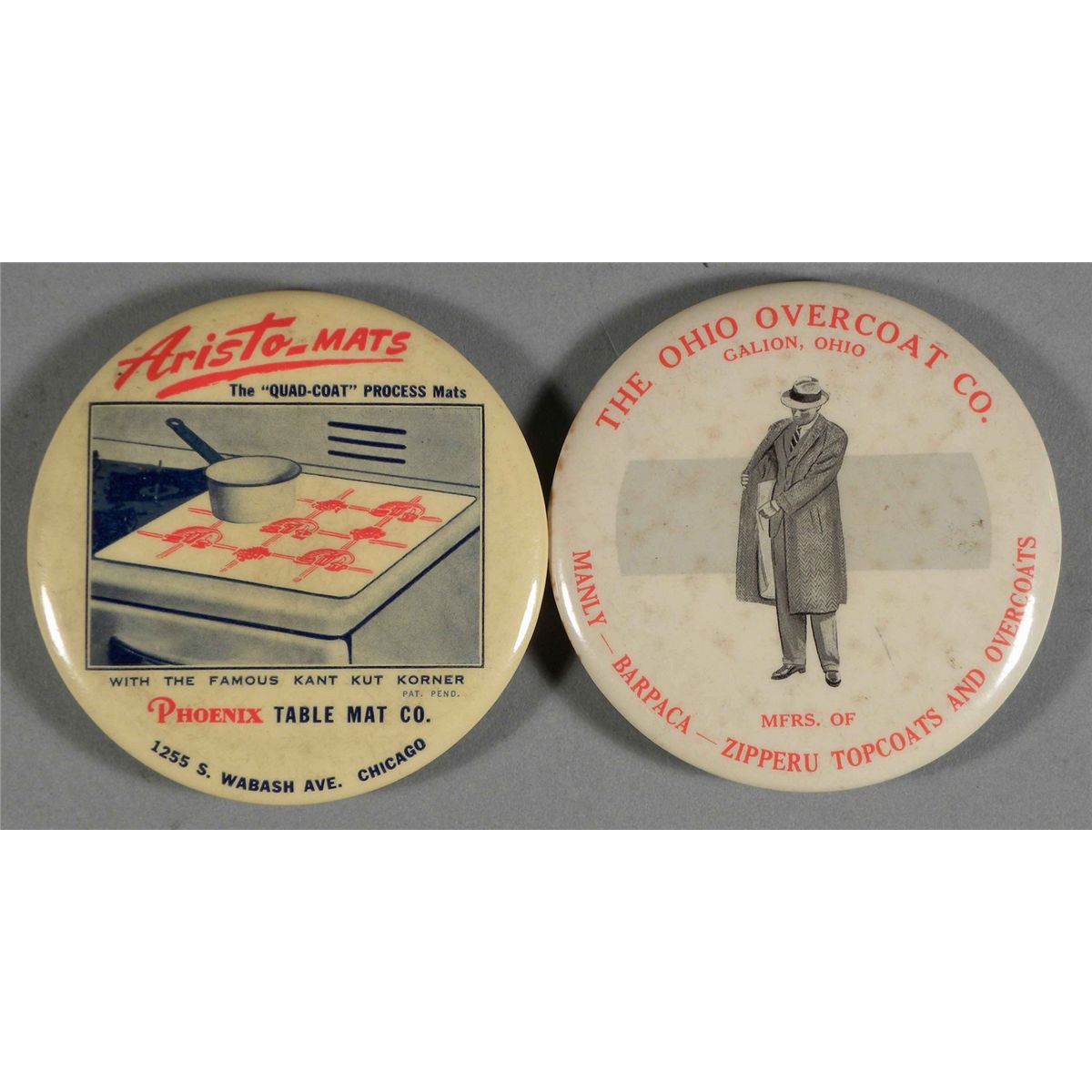 Lot of 2 Celluloid Advertising Mirror Paper Weights. The Ohio Overcoat Co. Galion, OH. Aristo-Mats, Phoenix Table Mat Co. Chicago. Both in very good condition. 3 1/2 inch diameter. Start Price $40