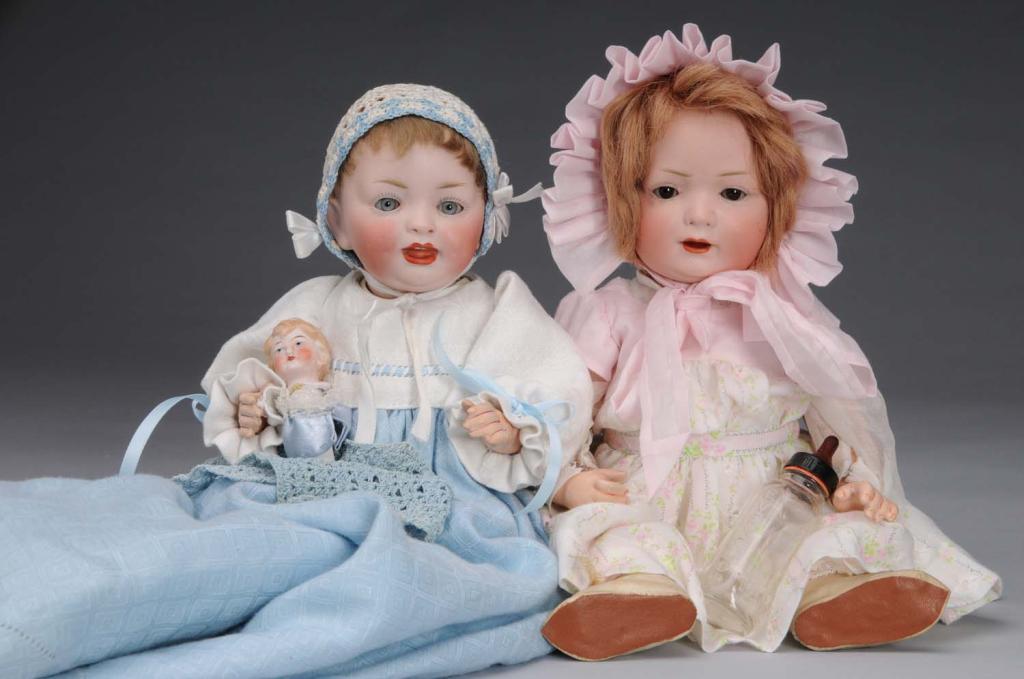 German, circa 1910. One with a bisque socket head incised "152", by Hertel, Schwab & Co. Sleeping eyes, open mouth with molded teeth and tongue, and original mohair wig. Composition baby body wearing new baby clothes. The other with bisque socket head incised "585", by Bahr & Proschild. Sleeping eyes, open mouth, and composition baby body with repainted arms. Wearing new cotton dress. Condition (Very Good). Size Each: 12" T.