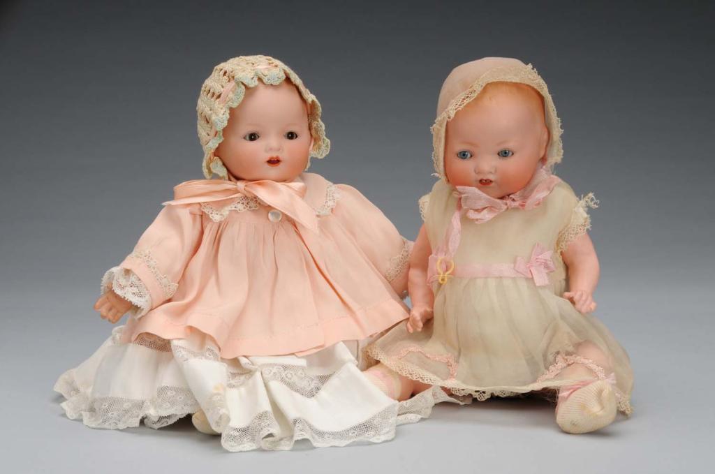 German, circa 1925. One with bisque head incised "A.M. 351". Has blue sleeping eyes, open mouth with two lower teeth, and molded hair. Five-piece composition body. Wearing all original clothing with organdy dress and matching hat, socks, and pink satin ribbons. Other with bisque head incised "A.M. Germany". Unusual mold with brown sleeping eyes, fat cheeks, and open mouth with two upper teeth. Has cloth body with celluloid hands and is nicely dressed in vintage clothing. Condition (Excellent). Size Each: 11" L.