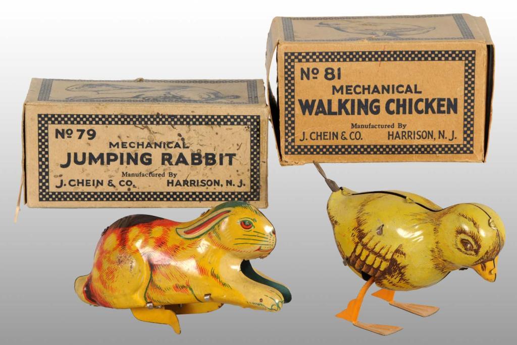 Description Circa 1930s. Working. Both are marked "J. Chein and Company Made in USA". Minor wear on animals with small spot of oxidation on rabbit. Includes original and scarce boxes. Jumping Rabbit box is marked "#729" with small one-inch pieces missing on flap and Walking Chicken "#81" box with one top flap detached but present. Condition (Very Good - Excellent). Size 5" L.
