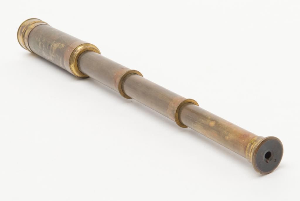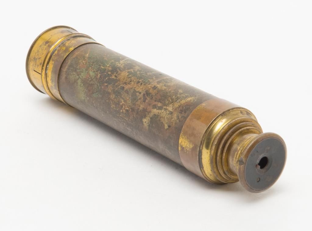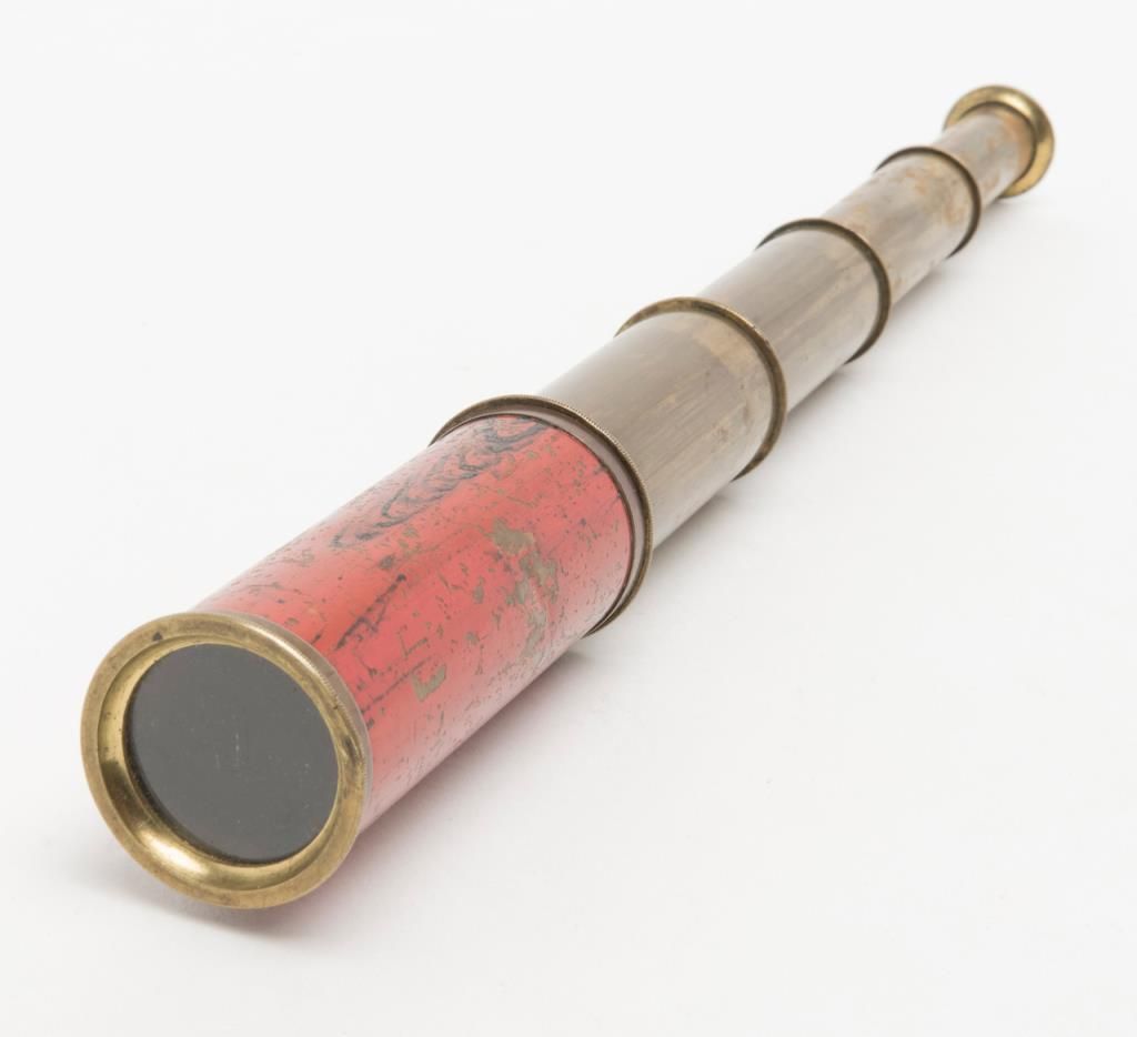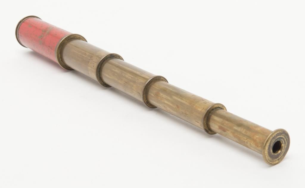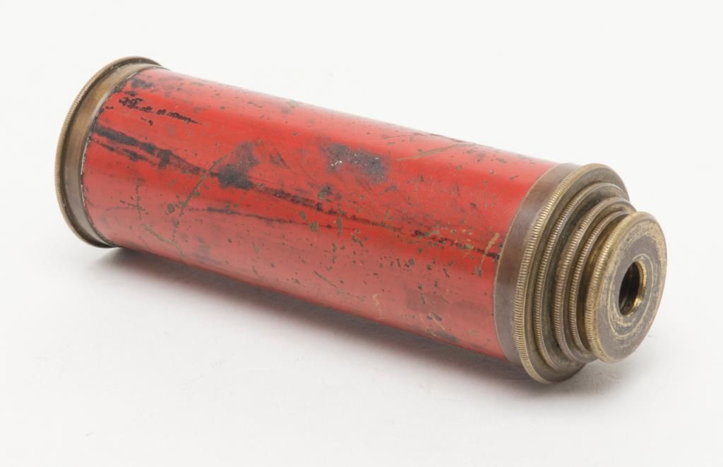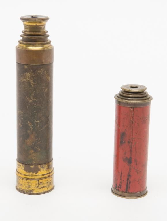 Lot of 2 Civil War-era hand-held collapsible brass pocket telescopes, one approx. 1-3/8” in diameter and retaining most of its original red paint, the other approx. 1-1/2” in diameter and retaining its brass front lens cover; both in overall goodcondition. Est.: $150-$300.