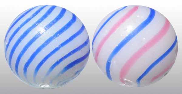 Description The red and blue band marble has a sizeable chip out of side while the blue band marble has minor surface wear. Condition (8.5). Size Both: 25/32" Dia.
