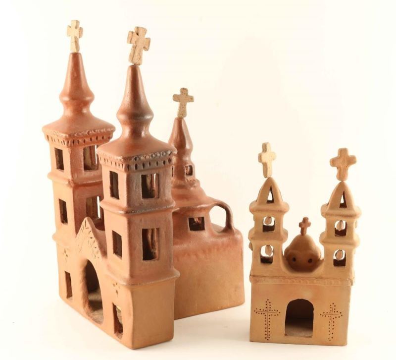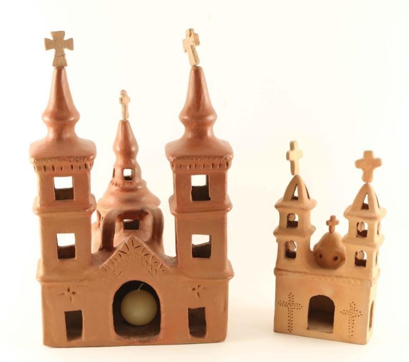 One large church measures 17 1/2"x11 1/2"x1 1/2" and one smaller church 12"x6"x4". Both used to hold candles.