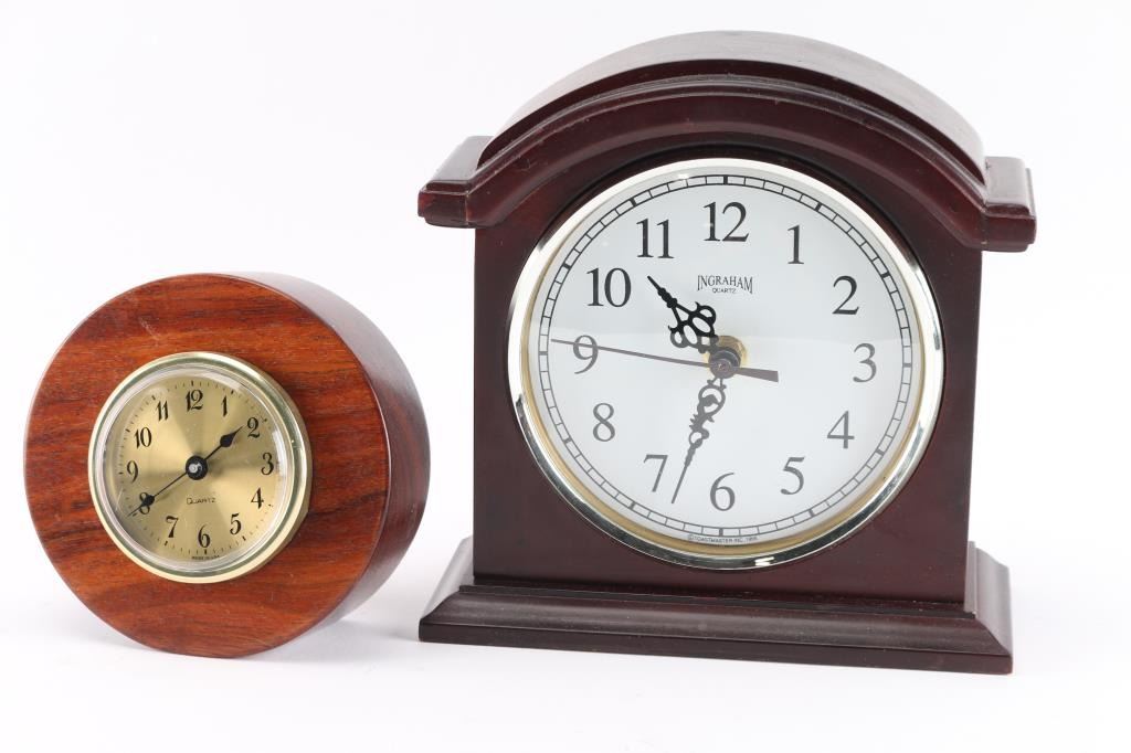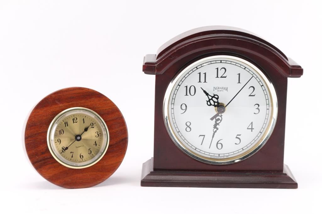 1- 2.5" dial in Koa wood stand.2- Ingraham, 5" dial in wood case. 7-1/2"H x 7-1/2"W.