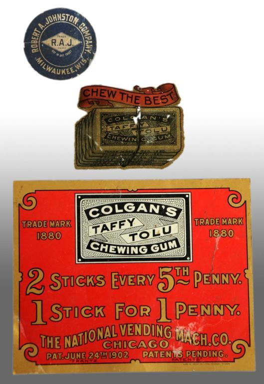 Description Circa 1902. Includes one tin and brass sign that goes on the Taffy Tolu machine in the Bill Enes “Silent Salesman Too” page 149. Has strong, vivid colors. A few scratches and some wear. Also includes glass from a chewing gum machine with a decal featuring gum and patent date of 1880 and a blue decal. One piece missing from a corner and edge chips. Condition (Very Good - Excellent). Size Largest: 6 - 1/8" x 9".