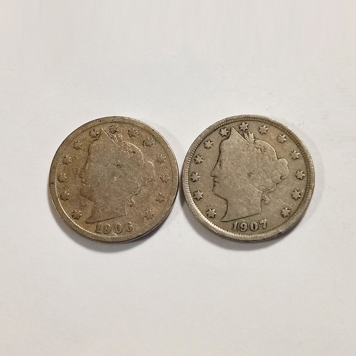 Lot of 2 Collectible US Liberty Head 5 cents coins. 1906-1907.