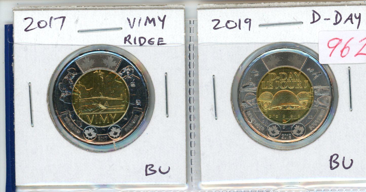 Lot of 2 Commemorative Toonies. Includes 2017 Vimy Ridge & 2019 D-Day. Both BU from original rolls.