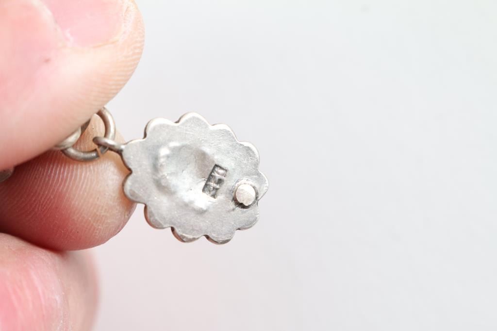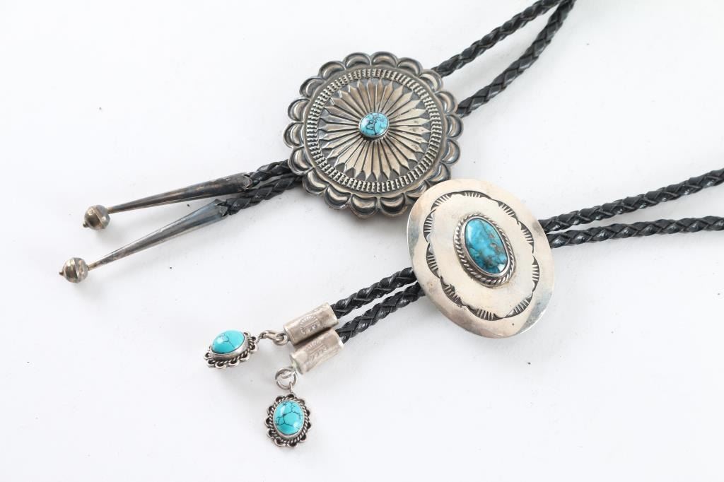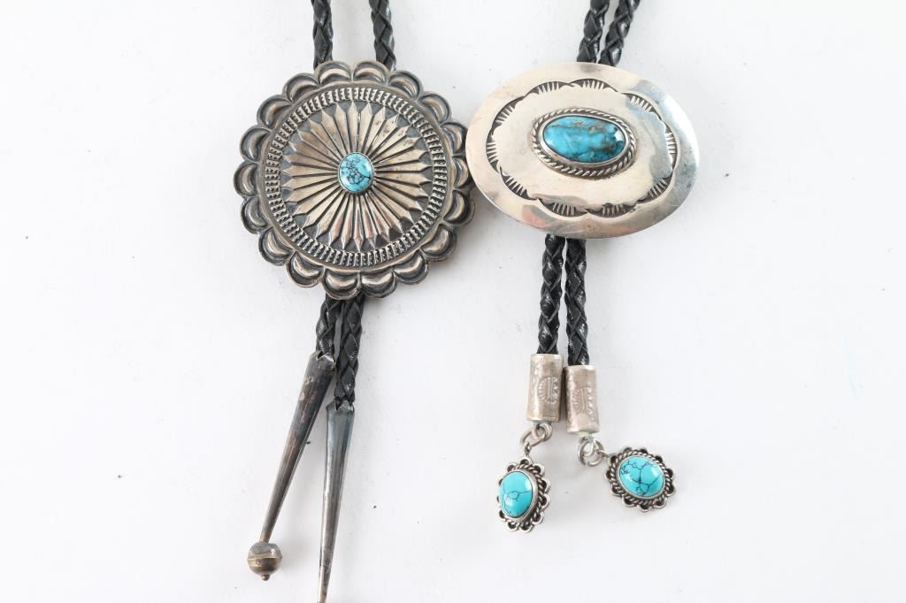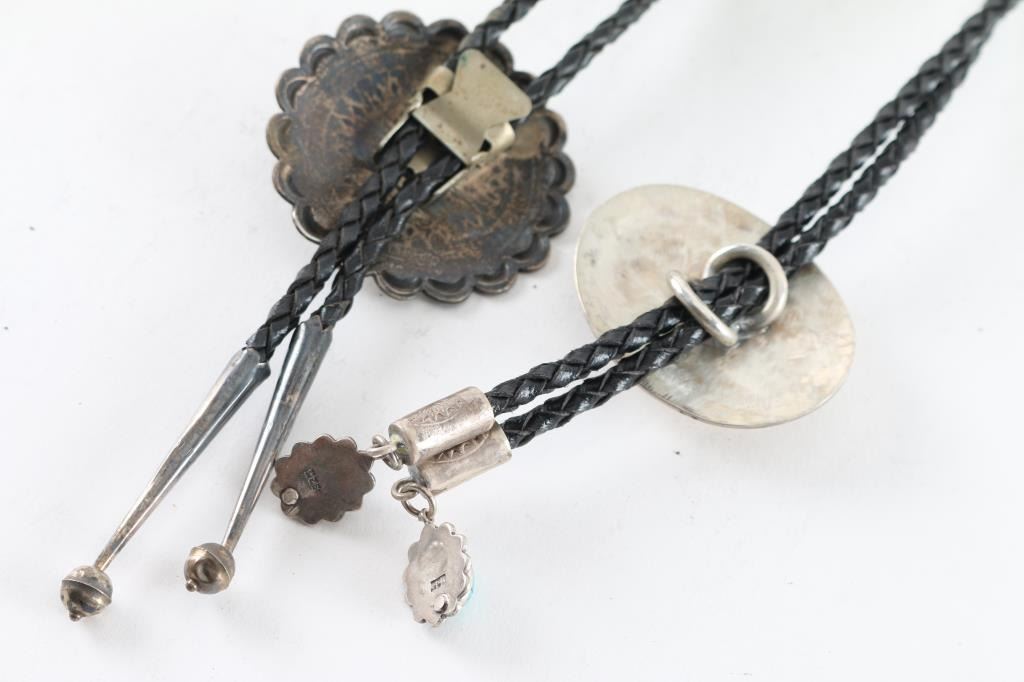 (1) Round Concho with spider-web turquoise accents, maker marked D.Delgarito, sterling silver (2) Oval sterling concho accented with turquoise stones, unmarked,