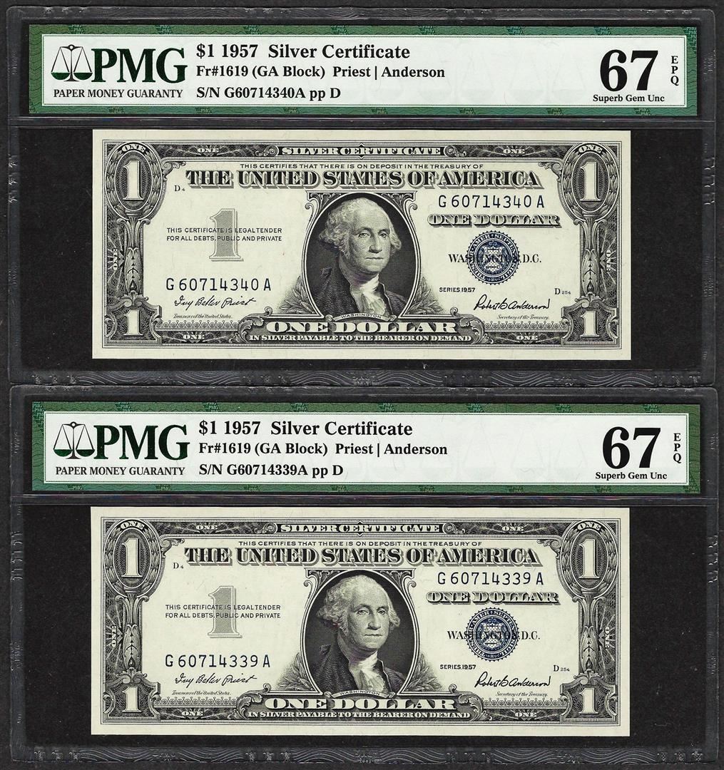 One Lot of (2) Consec. 1957 $1 Silver Certificate Notes PMG Superb Gem Unc 67PPQ. PMG Certified.