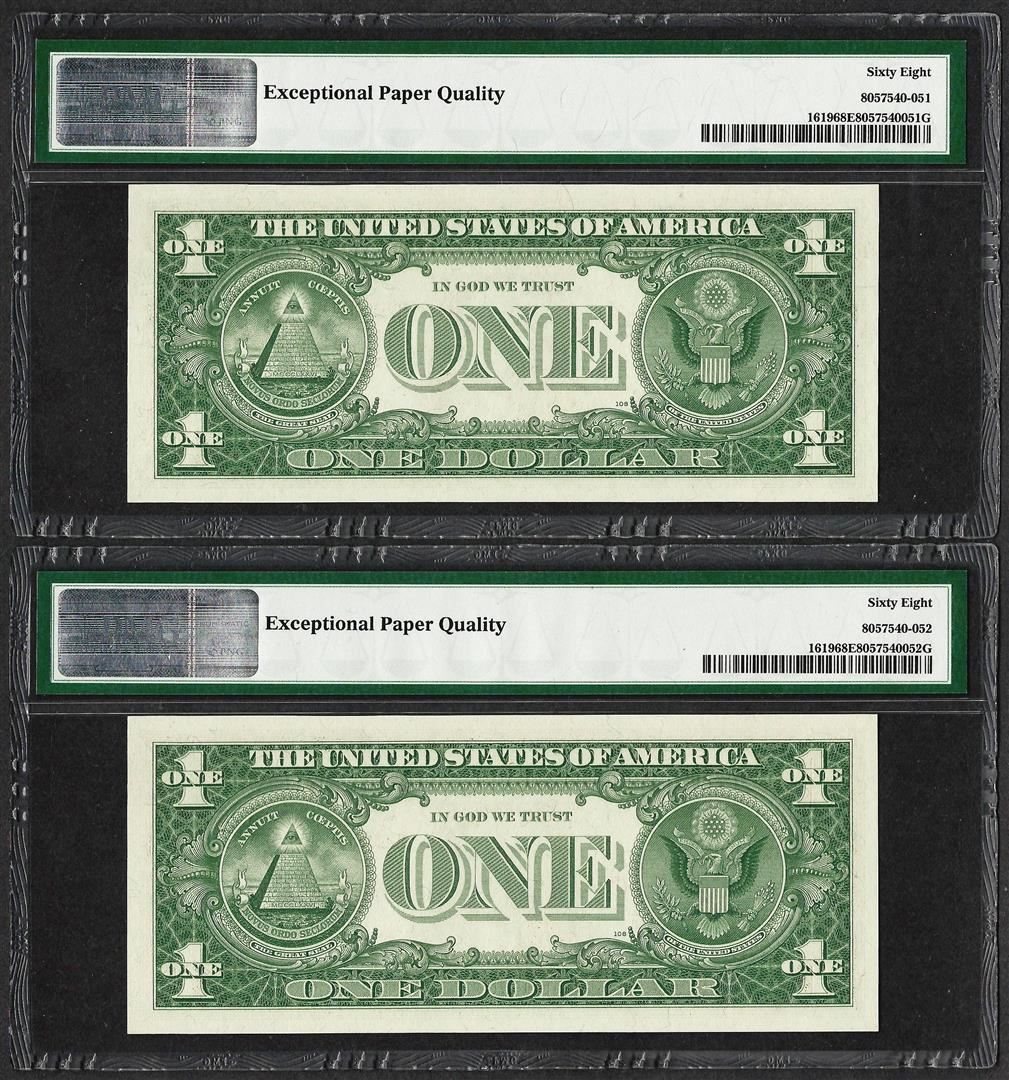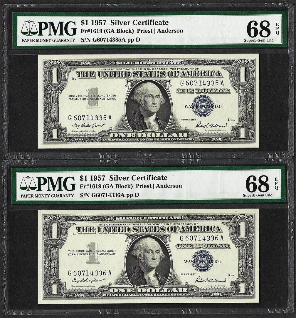 Lot of (2) Consec. 1957 $1 Silver Certificate Notes PMG Superb Gem Unc 68PPQ