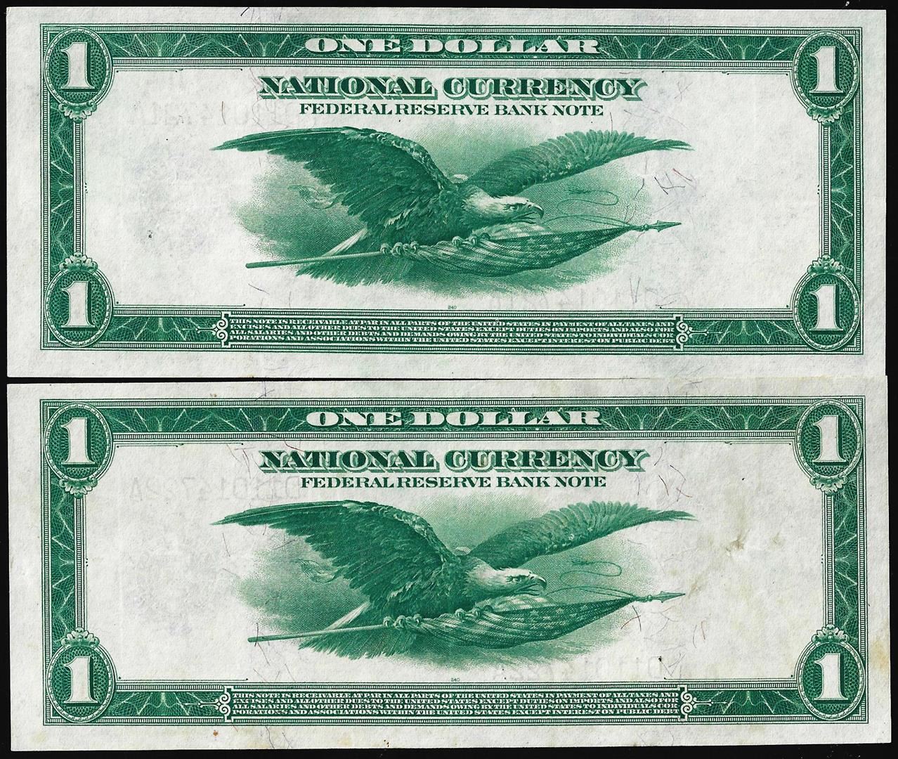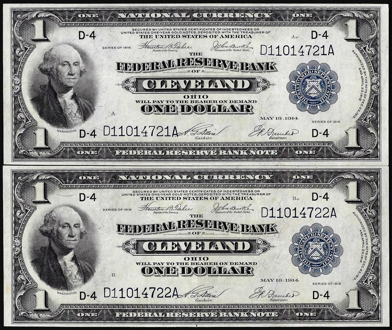 Lot of (2) Consecutive 1918 $1 Federal Reserve Bank Notes Cleveland