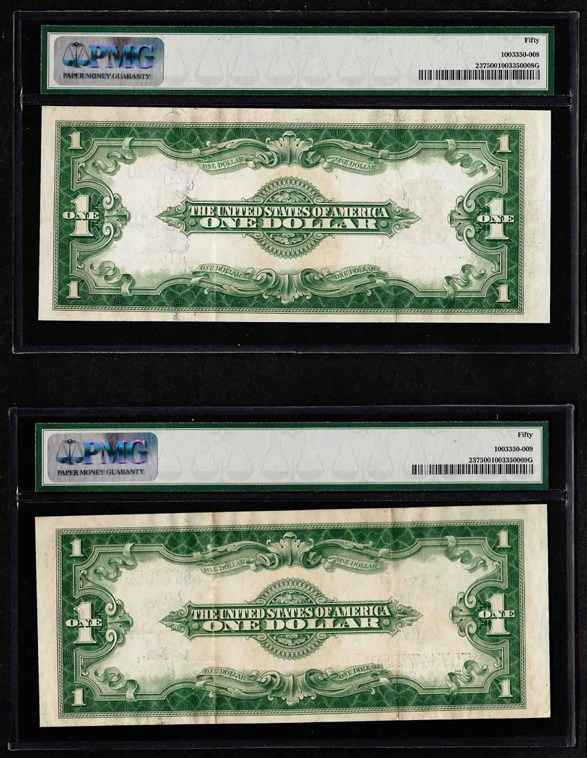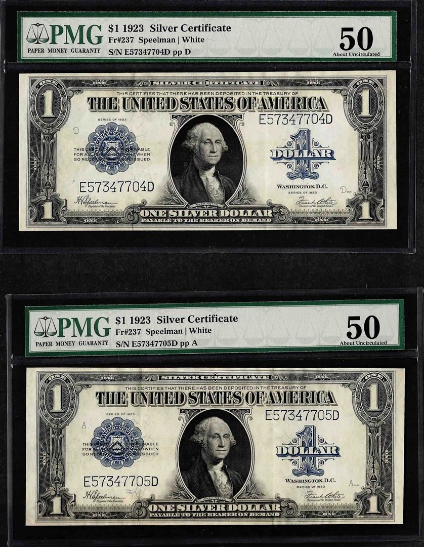 One Lot of (2) Consecutive 1923 $1 Silver Certificate Notes Fr.237 PMG About Uncirculated 50. PMG Certified.