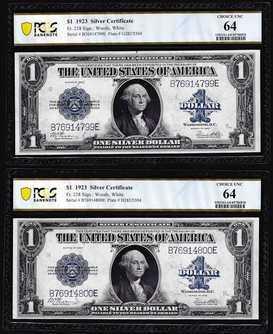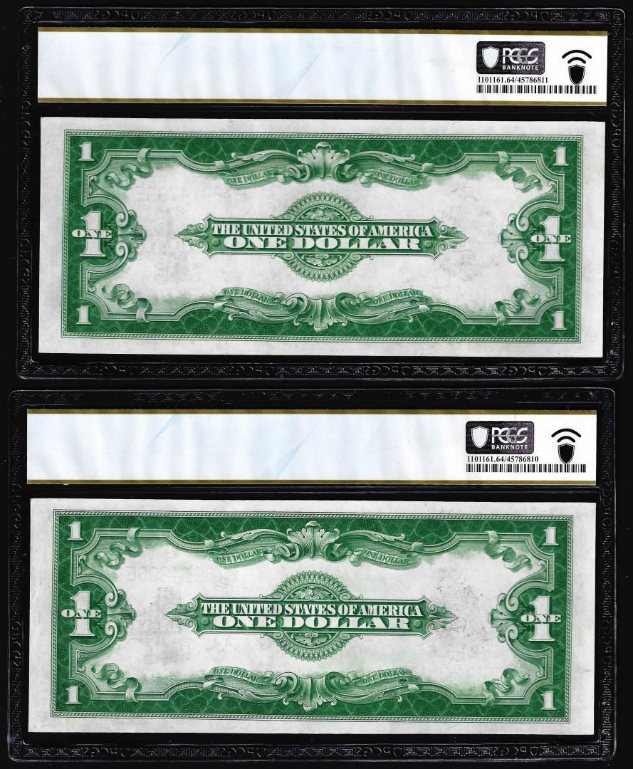Lot of (2) Consecutive 1923 $1 Silver Certificate Notes PCGS Choice Uncirculated 64