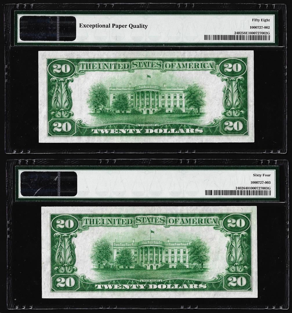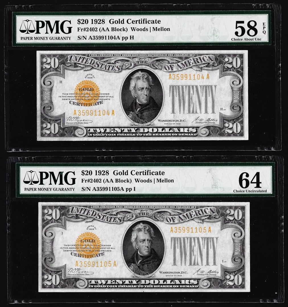 One Lot of (2) Consecutive 1928 $20 Gold Certificate Notes Fr.2402 PMG Choice 58EPQ/64. PMG Certified.