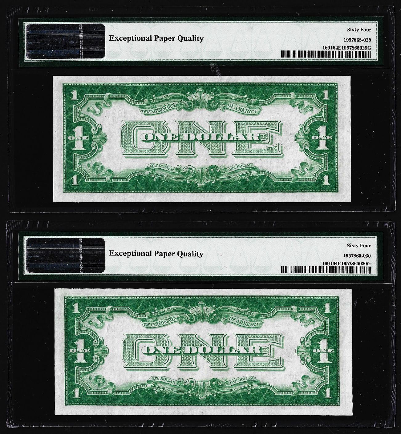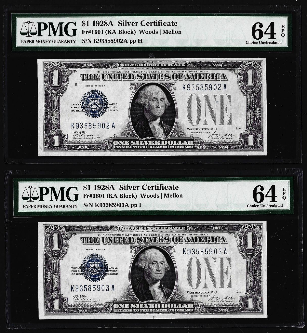 One Lot of (2) Consecutive 1928A $1 Funnyback Silver Certificate Notes Fr.1601 PMG Choice Uncirculated 64EPQ.