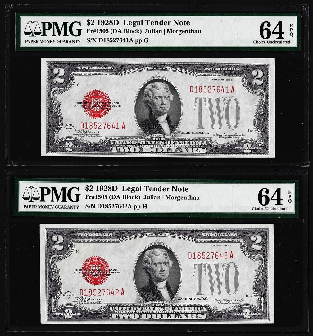 Lot of (2) Consecutive 1928D $2 Legal Tender Notes Fr.1505 PMG Choice Uncirculated 64EPQ