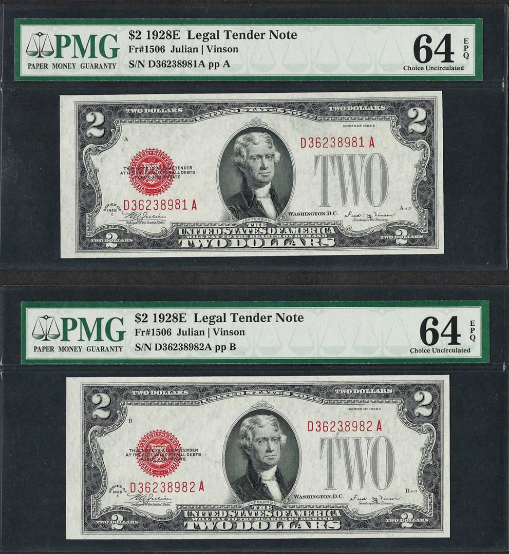 One Lot of (2) Consecutive 1928E $2 Legal Tender Notes PMG Choice Uncirculated 64EPQ. PMG Certified.