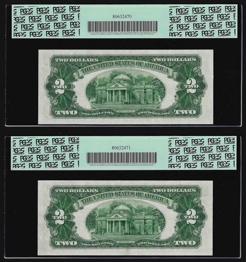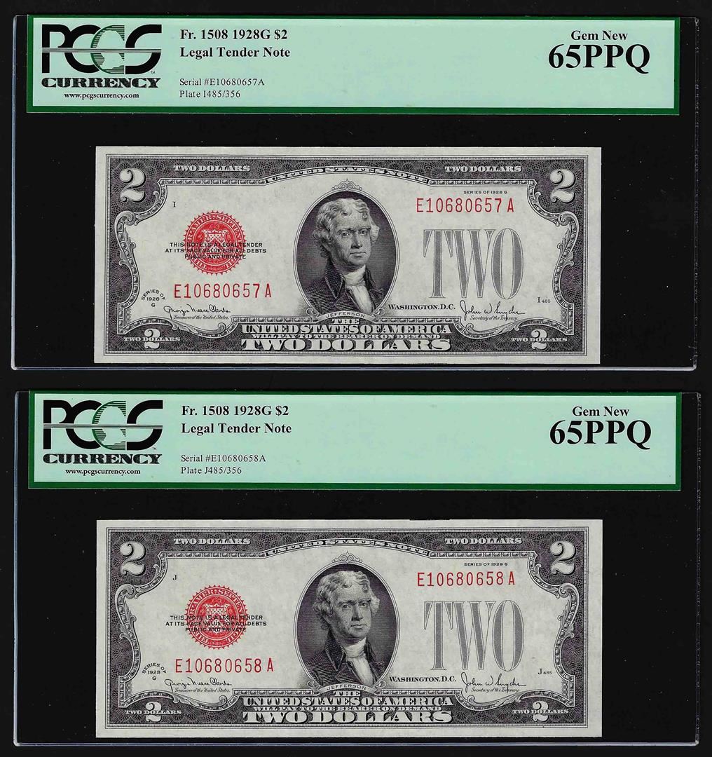 One Lot of (2) Consecutive 1928G $2 Legal Tender Notes PCGS Gem New 65PPQ. PCGS Graded.