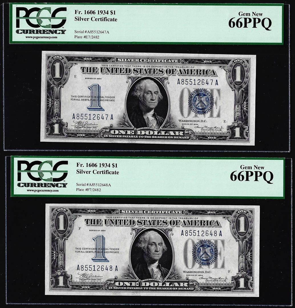 One Lot of (2) Consecutive 1934 $1 Silver Certificate Notes FR.1606 PCGS 66PPQ Gem New. PCGS Graded.