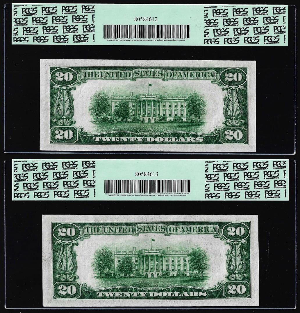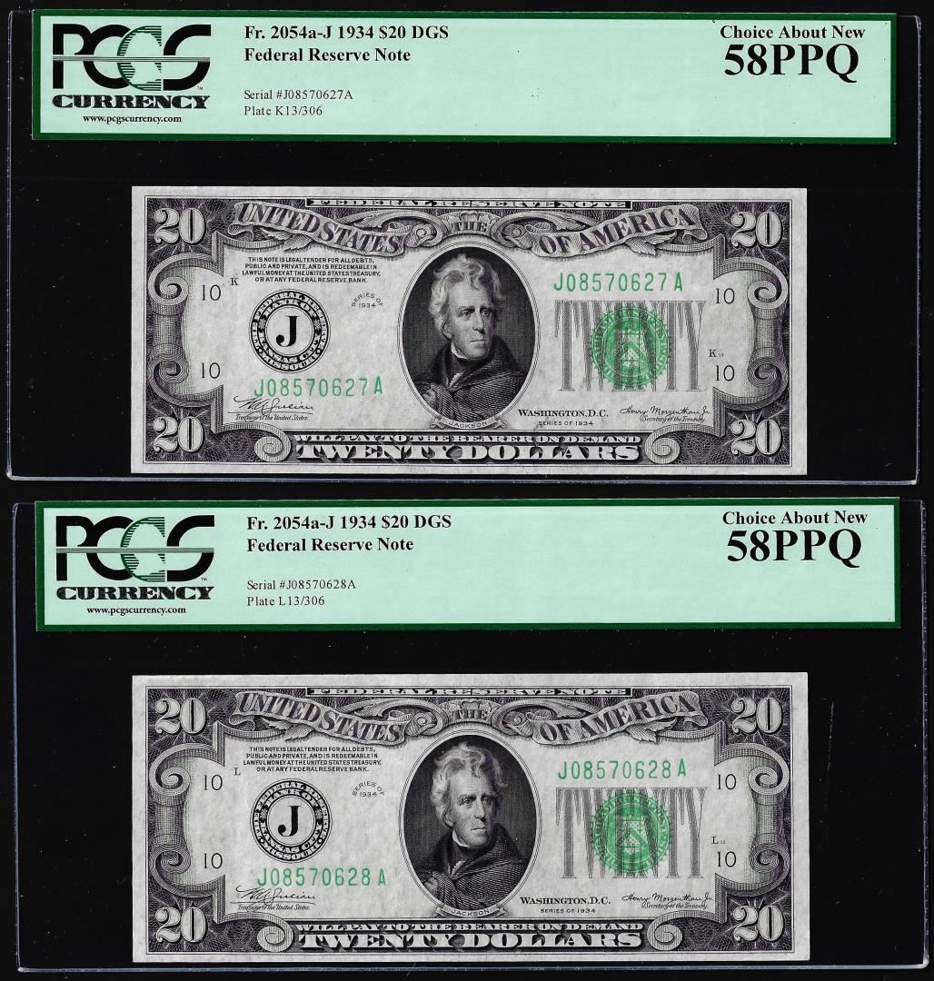 Lot of (2) Consecutive 1934 $20 Federal Reserve Notes PCGS Choice About New 58PPQ