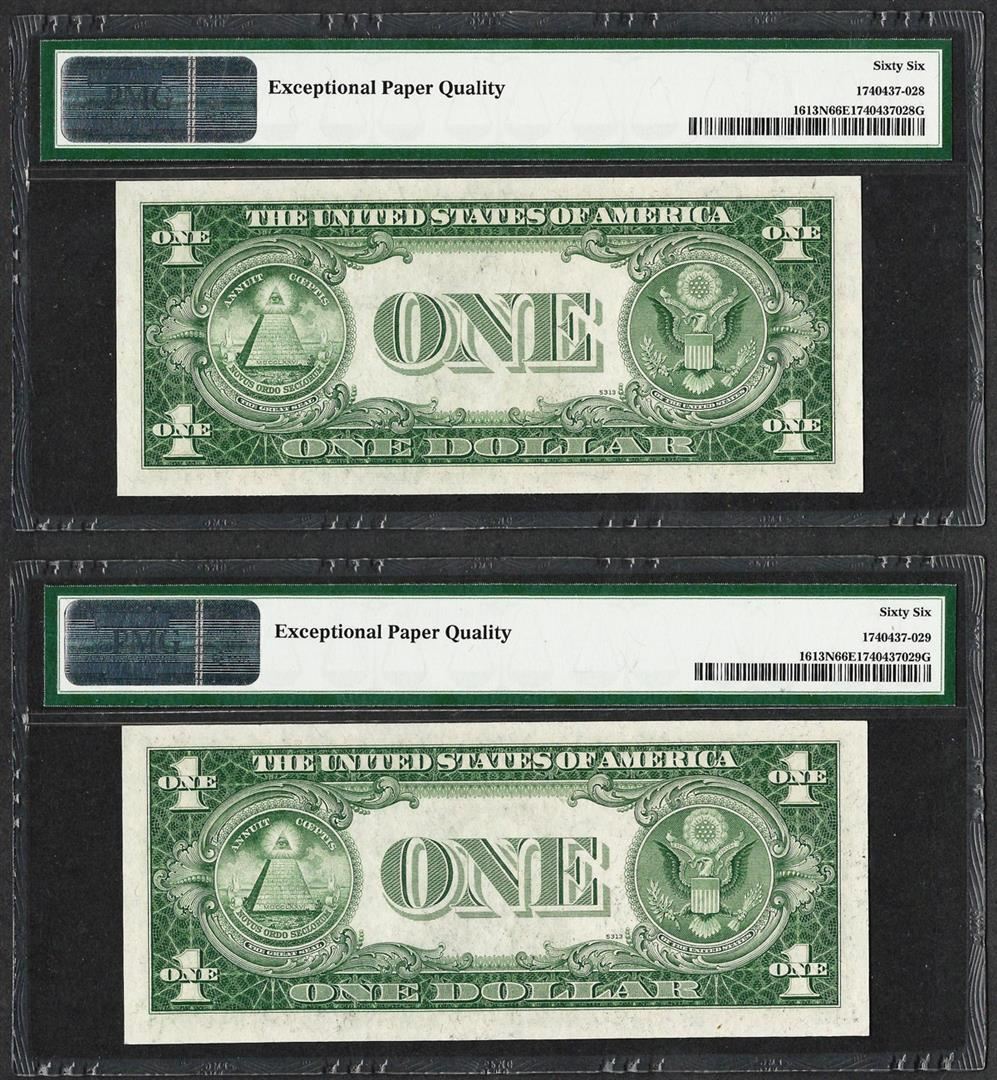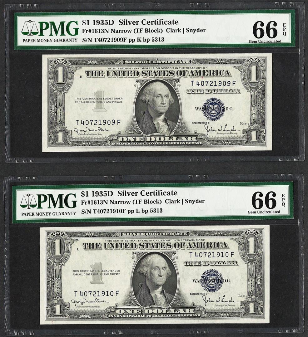 One Lot of (2) Consecutive 1935D $1 Silver Certificate Notes PMG Gem Uncirculated 66EPQ. PMG Appraised.
