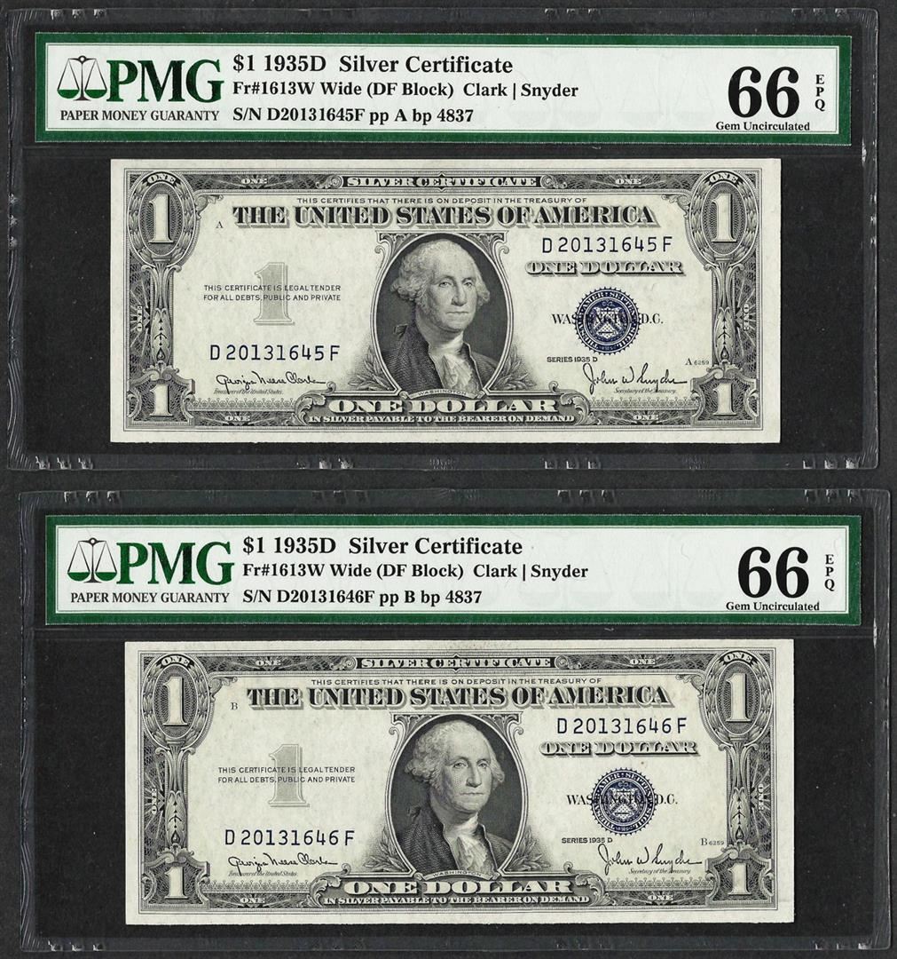 Lot of (2) Consecutive 1935D $1 Silver Certificate Notes PMG Gem Uncirculated 66