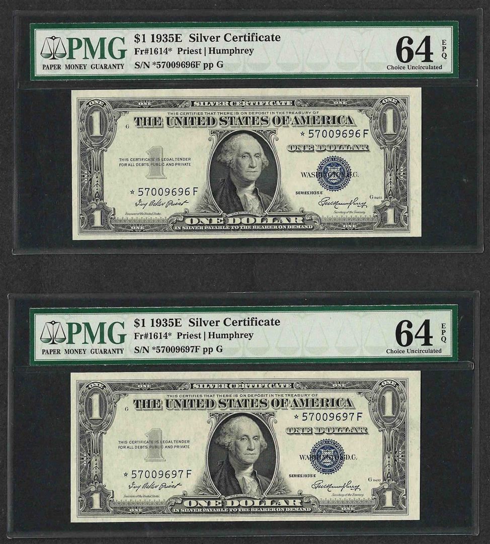 One Lot of (2) Consecutive 1935E $1 Silver Certificate STAR Notes PMG Choice Unc. 64EPQ. PMG Certified.