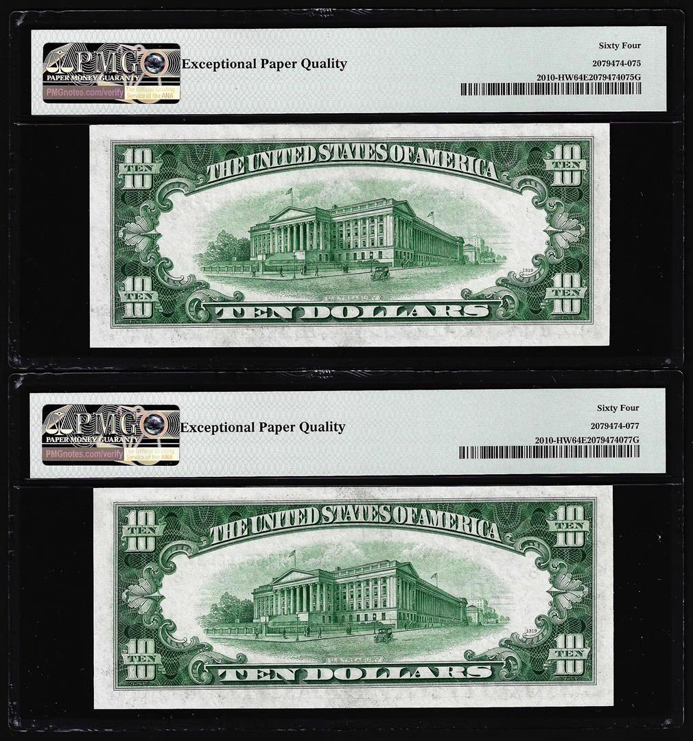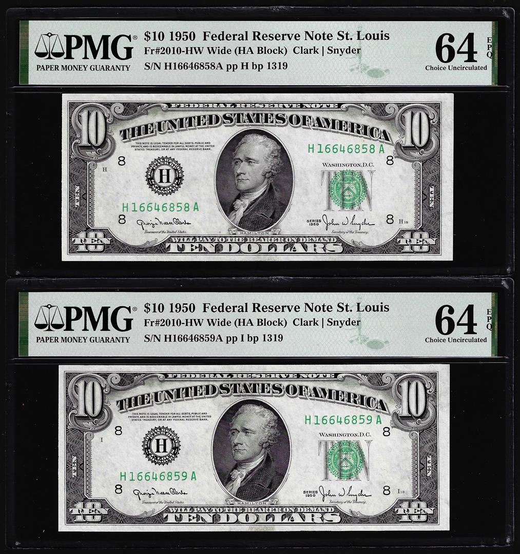 Lot of (2) Consecutive 1950 $10 Federal Reserve Notes PMG Choice Uncirculated 64EPQ