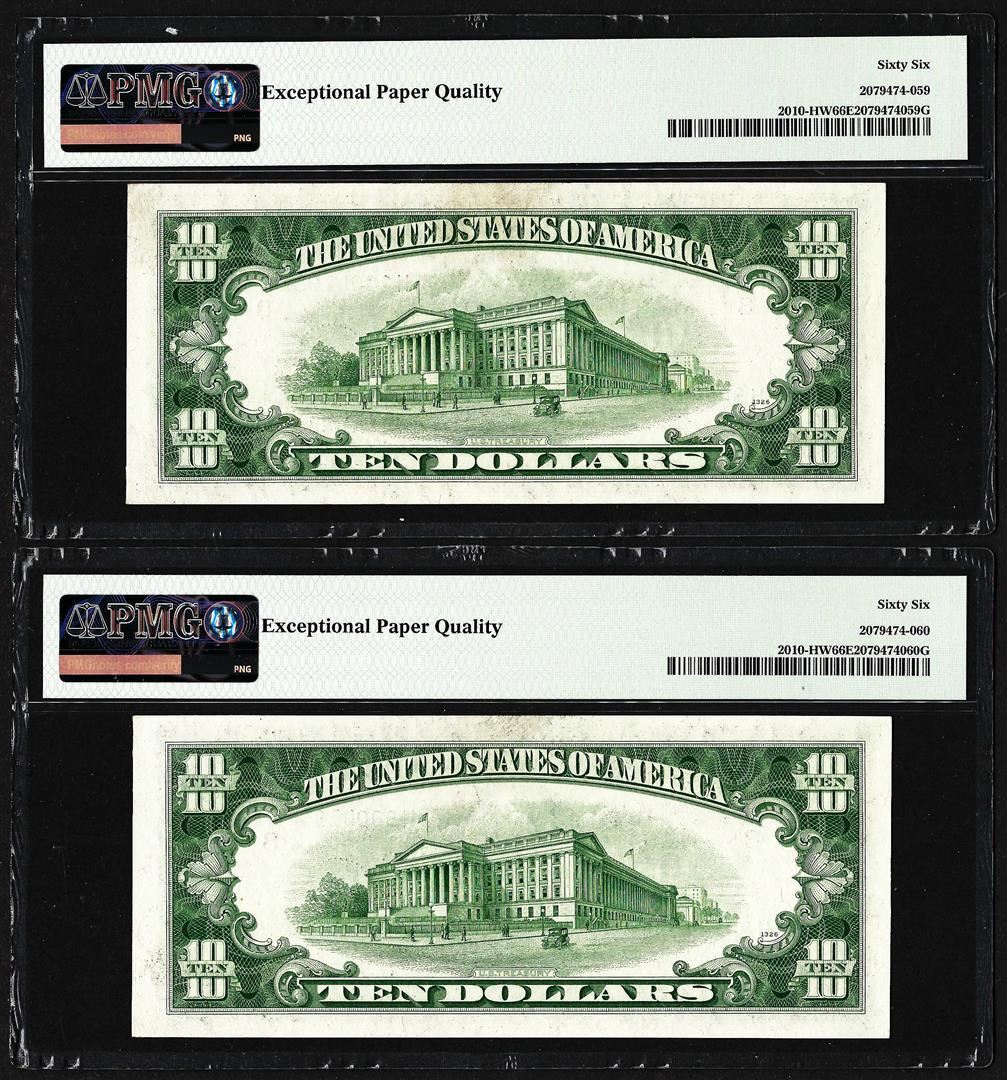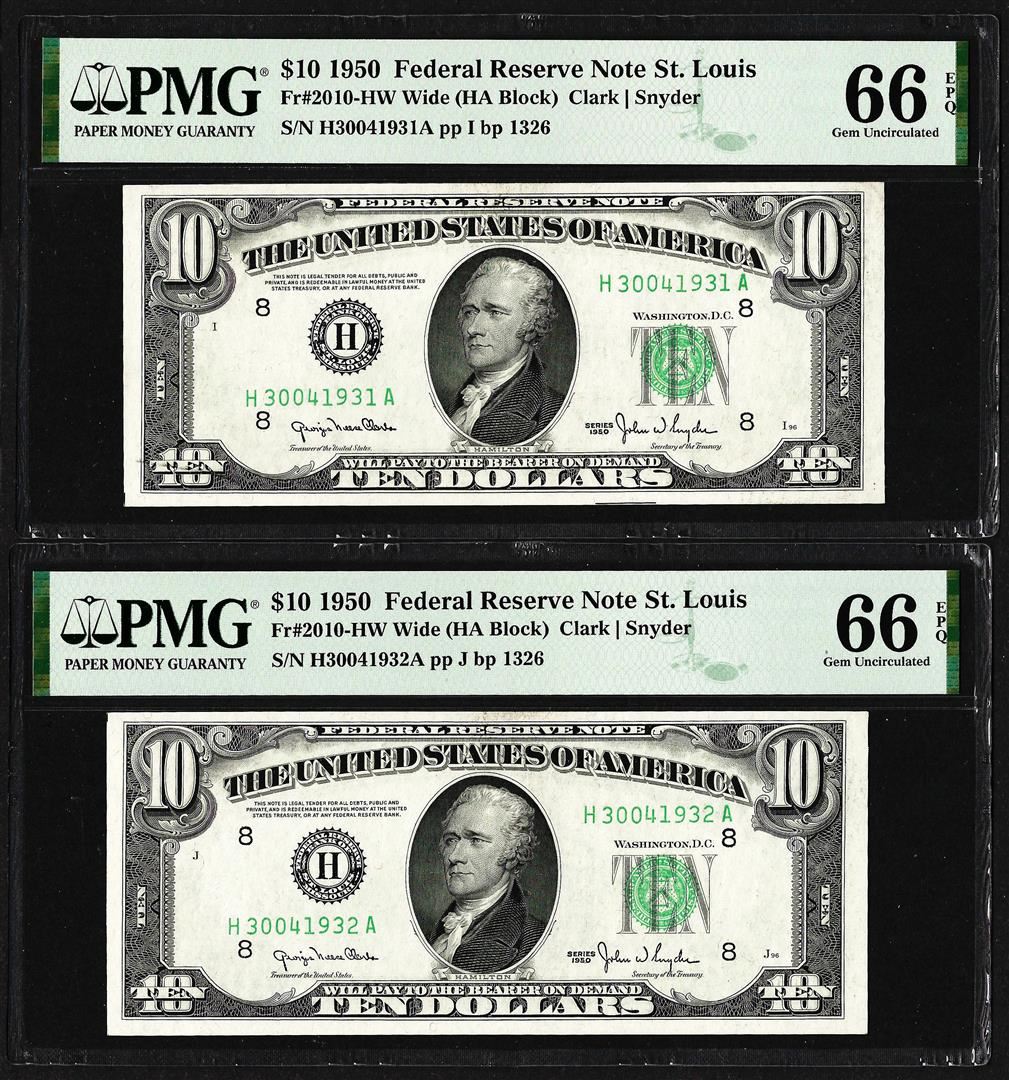 Lot of (2) Consecutive 1950 $10 Federal Reserve Notes STL PMG Gem Uncirculated 66EPQ