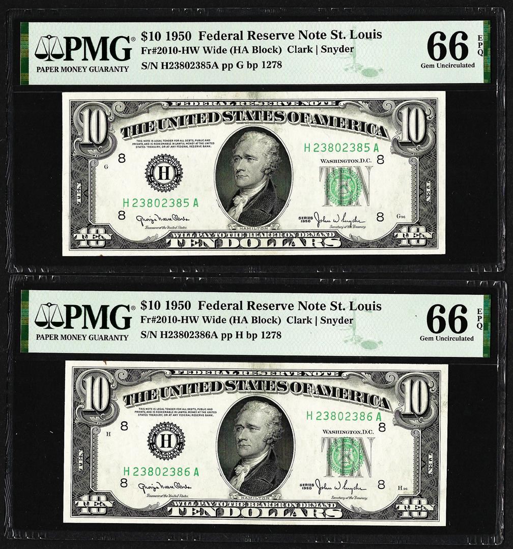 Lot of (2) Consecutive 1950 $10 Federal Reserve Notes STL PMG Gem Uncirculated 66EPQ