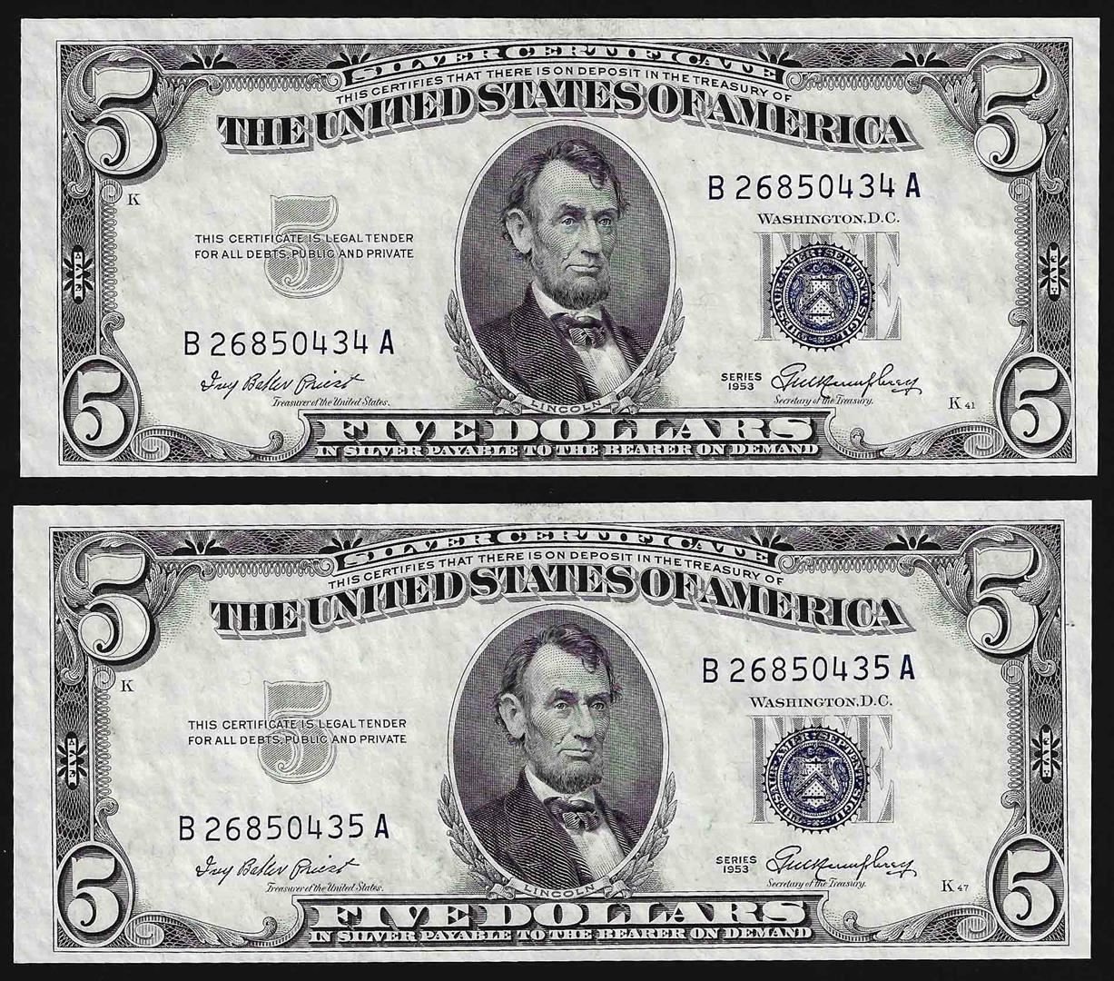 One Lot of (2) Consecutive 1953 $5 Silver Certificate Notes Choice Uncirculated.