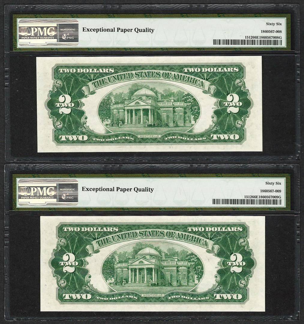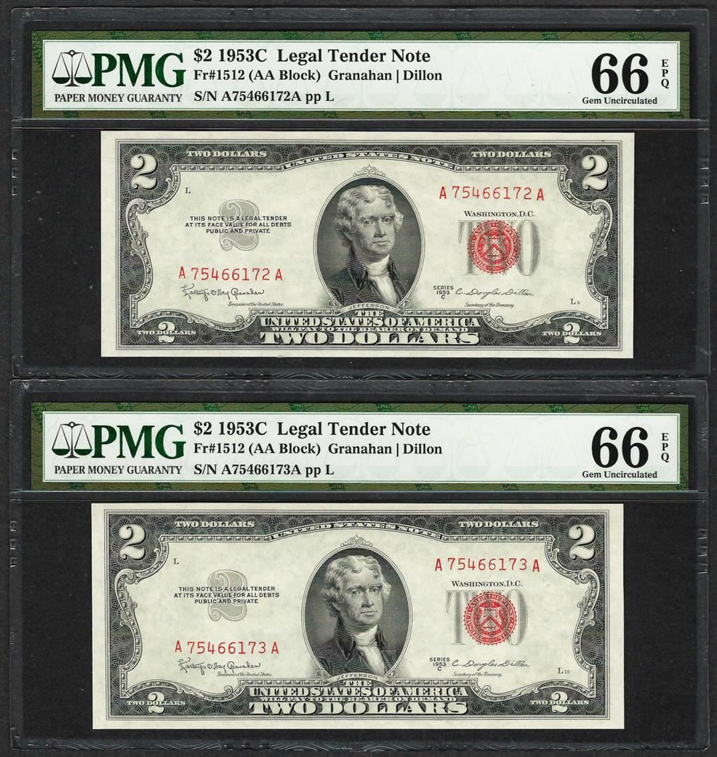 One Lot of (2) Consecutive 1953C $2 Legal Tender Notes Fr.1512 PMG Gem Uncirculated 66EPQ. PMG Certified.