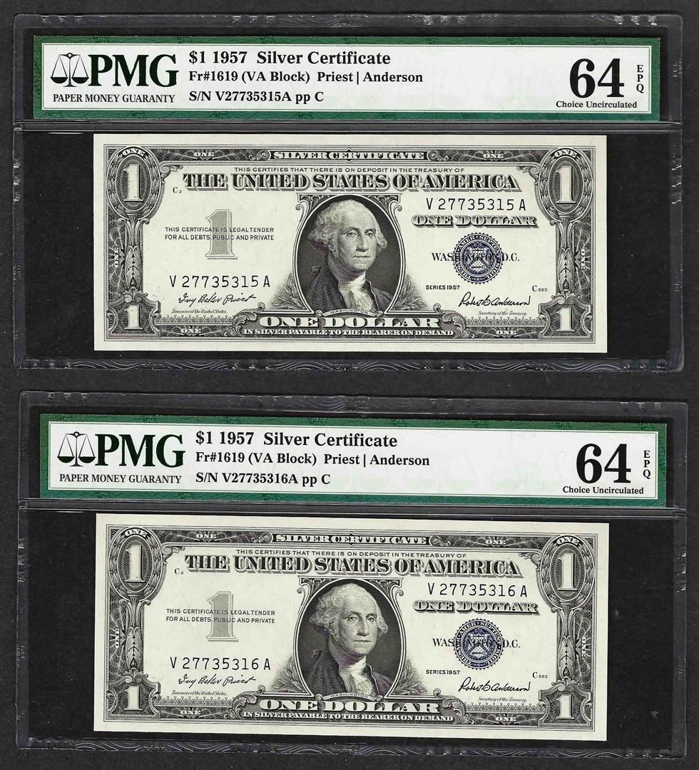 One Lot of (2) Consecutive 1957 $1 Silver Certificate Notes PMG Choice Uncirculated 64EPQ. PMG Certified.