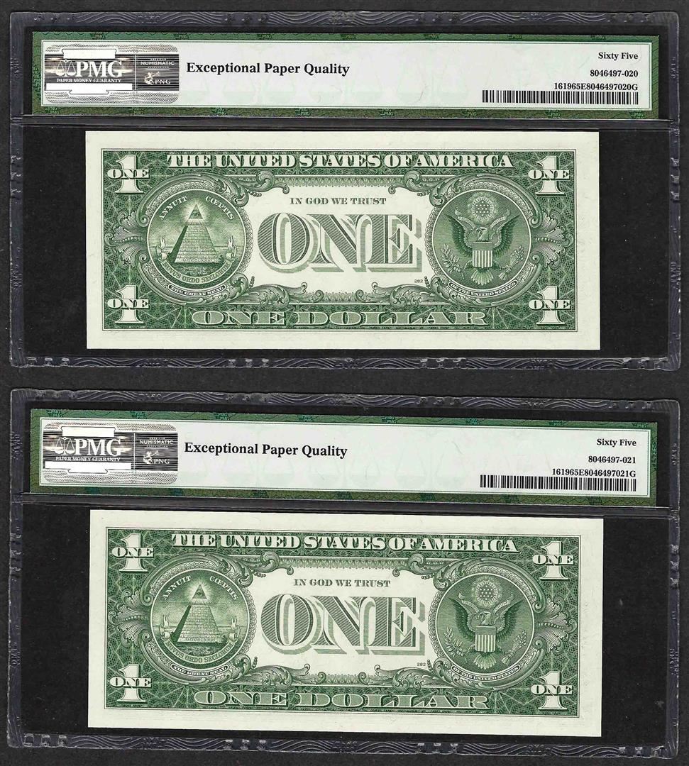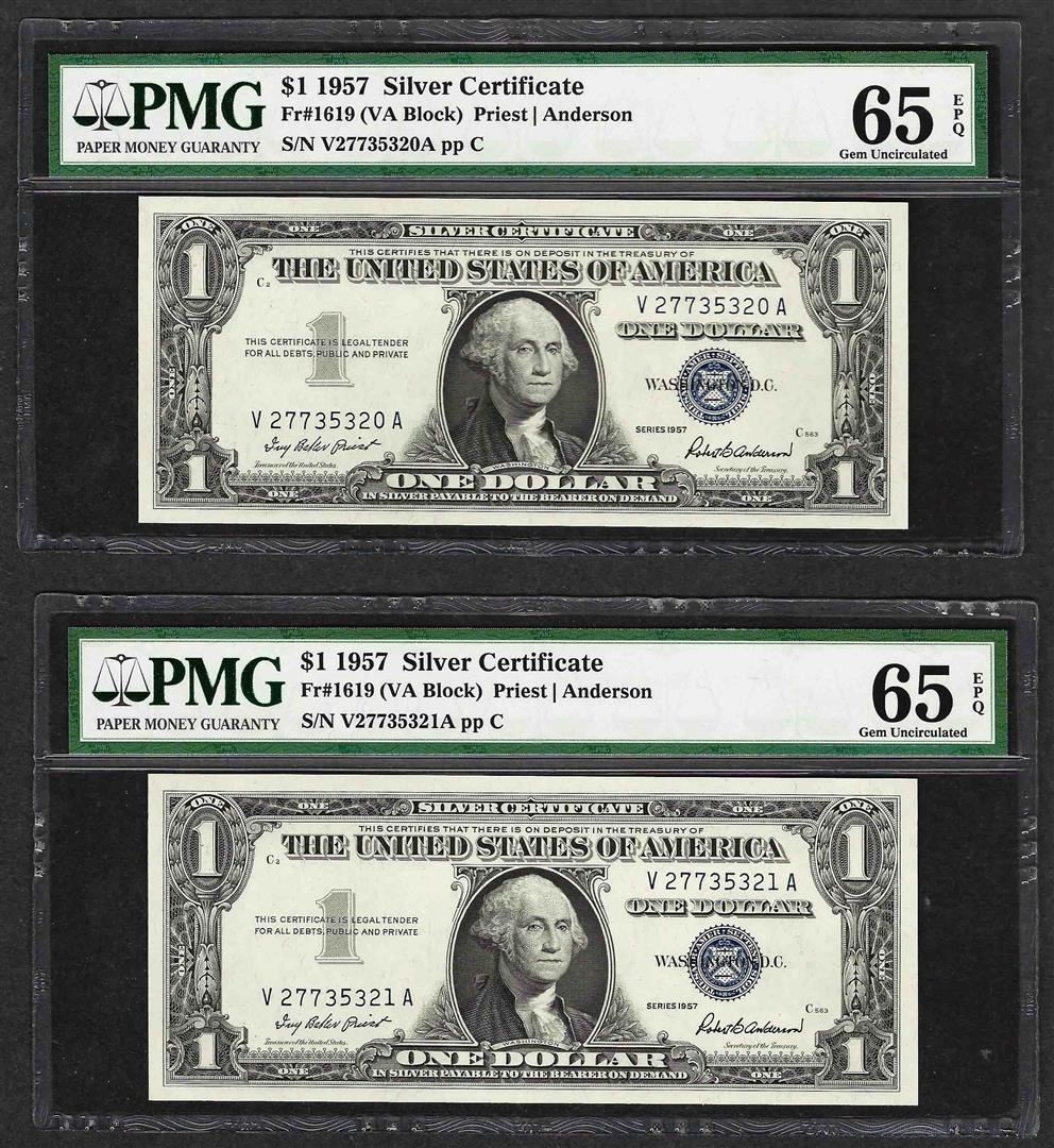 Lot of (2) Consecutive 1957 $1 Silver Certificate Notes PMG Gem Uncirculated 65E