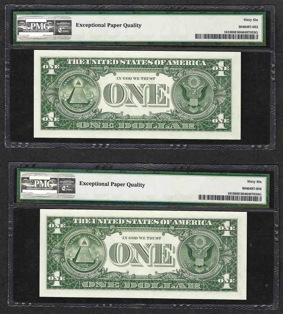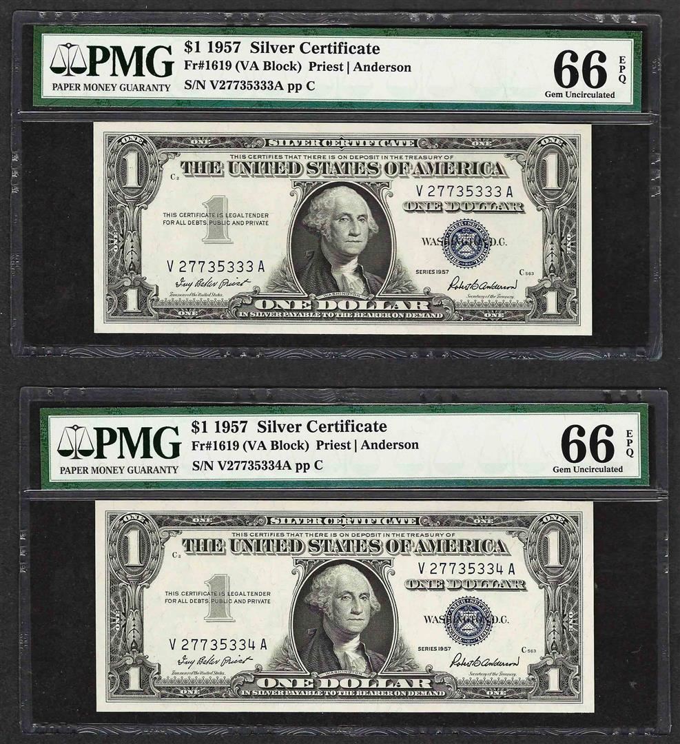 Lot of (2) Consecutive 1957 $1 Silver Certificate Notes PMG Gem Uncirculated 66E