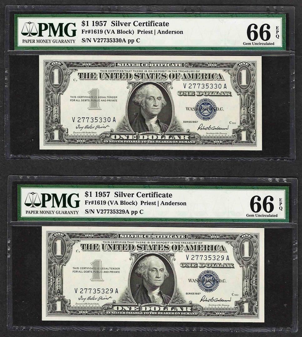 Lot of (2) Consecutive 1957 $1 Silver Certificate Notes PMG Gem Uncirculated 66E