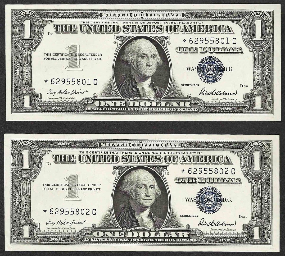 Lot of (2) Consecutive 1957 $1 Silver Certificate STAR Notes Uncirculated