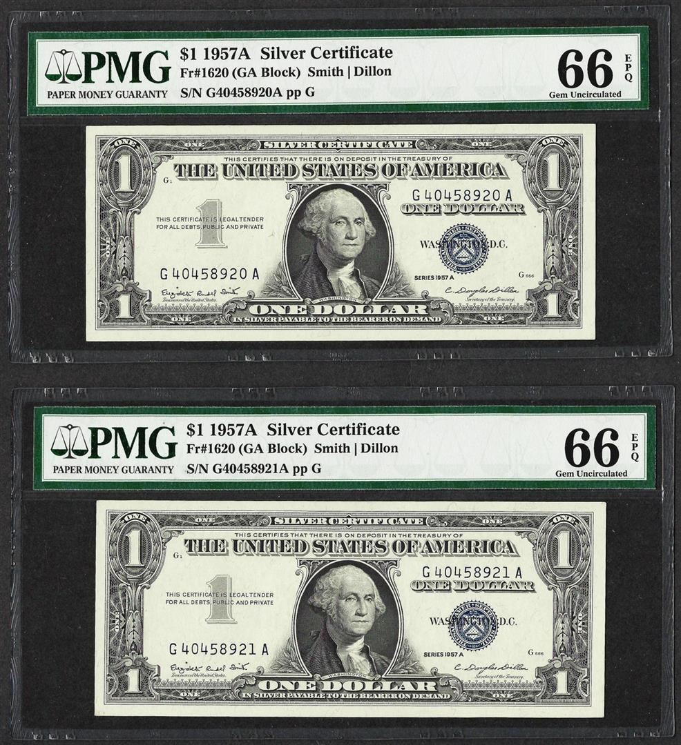 Lot of (2) Consecutive 1957A $1 Silver Certificate Notes PMG Gem Uncirculated 66