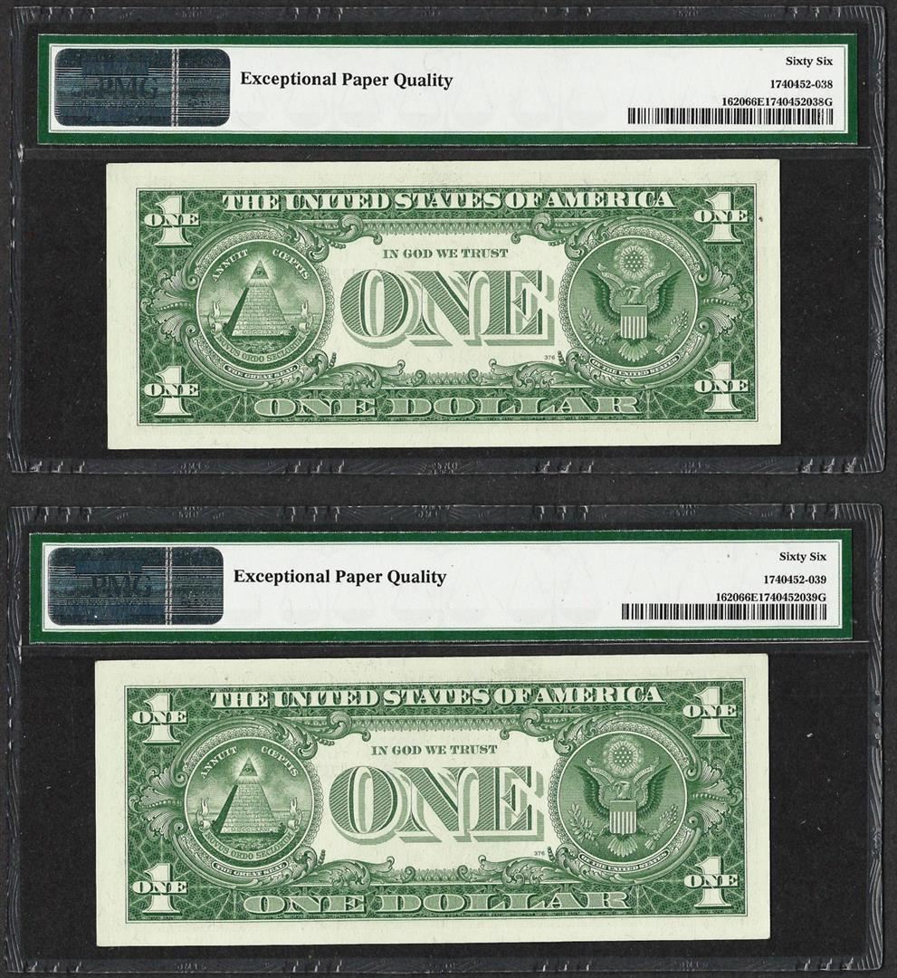 One Lot of (2) Consecutive 1957A $1 Silver Certificate Notes PMG Gem Uncirculated 66EPQ. PMG Certified.