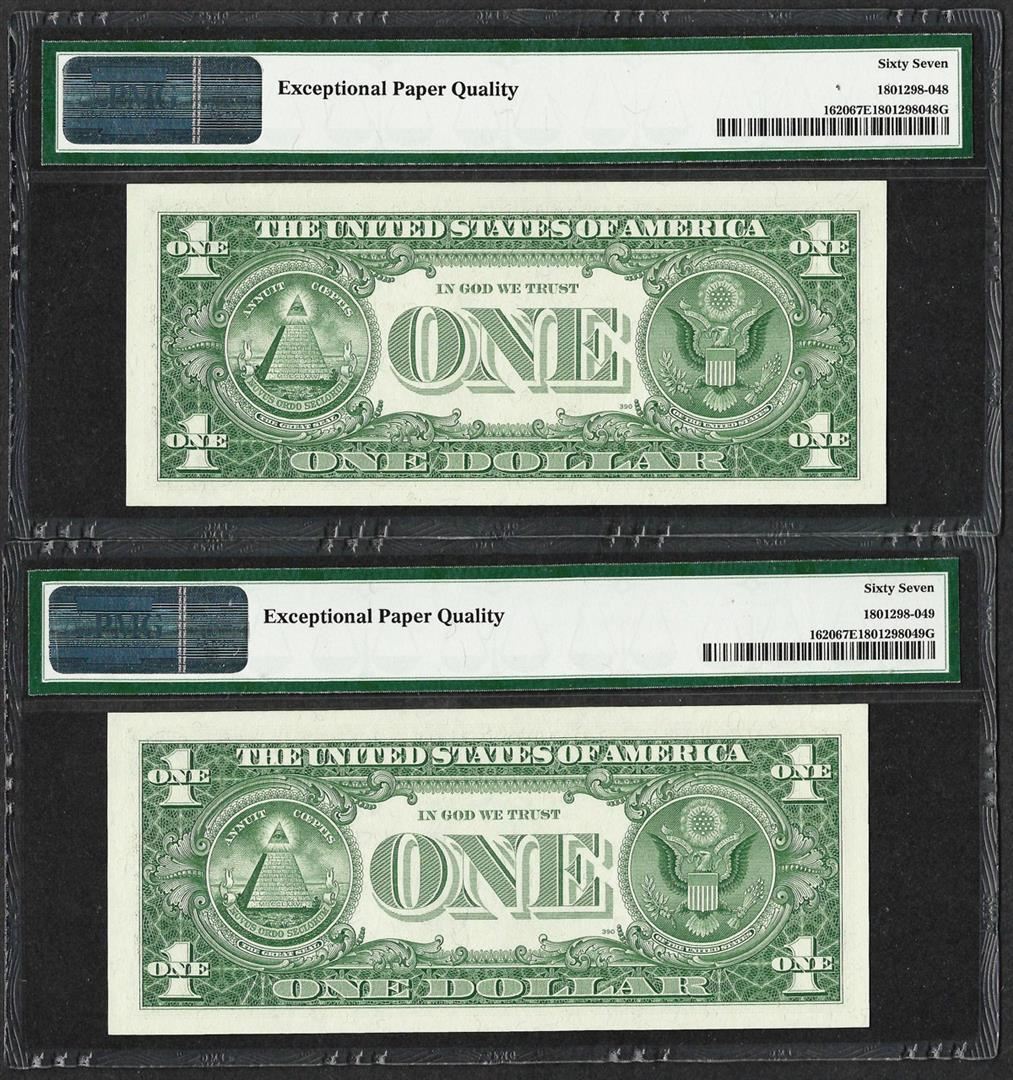 One Lot of (2) Consecutive 1957A $1 Silver Certificate Notes PMG Superb Gem Unc 67EPQ. PMG Appraised.