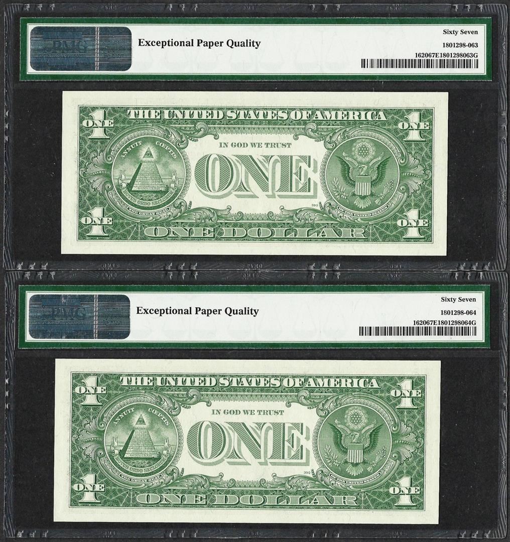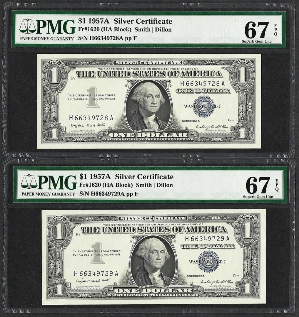 One Lot of (2) Consecutive 1957A $1 Silver Certificate Notes PMG Superb Gem Unc 67EPQ. PMG Certified.