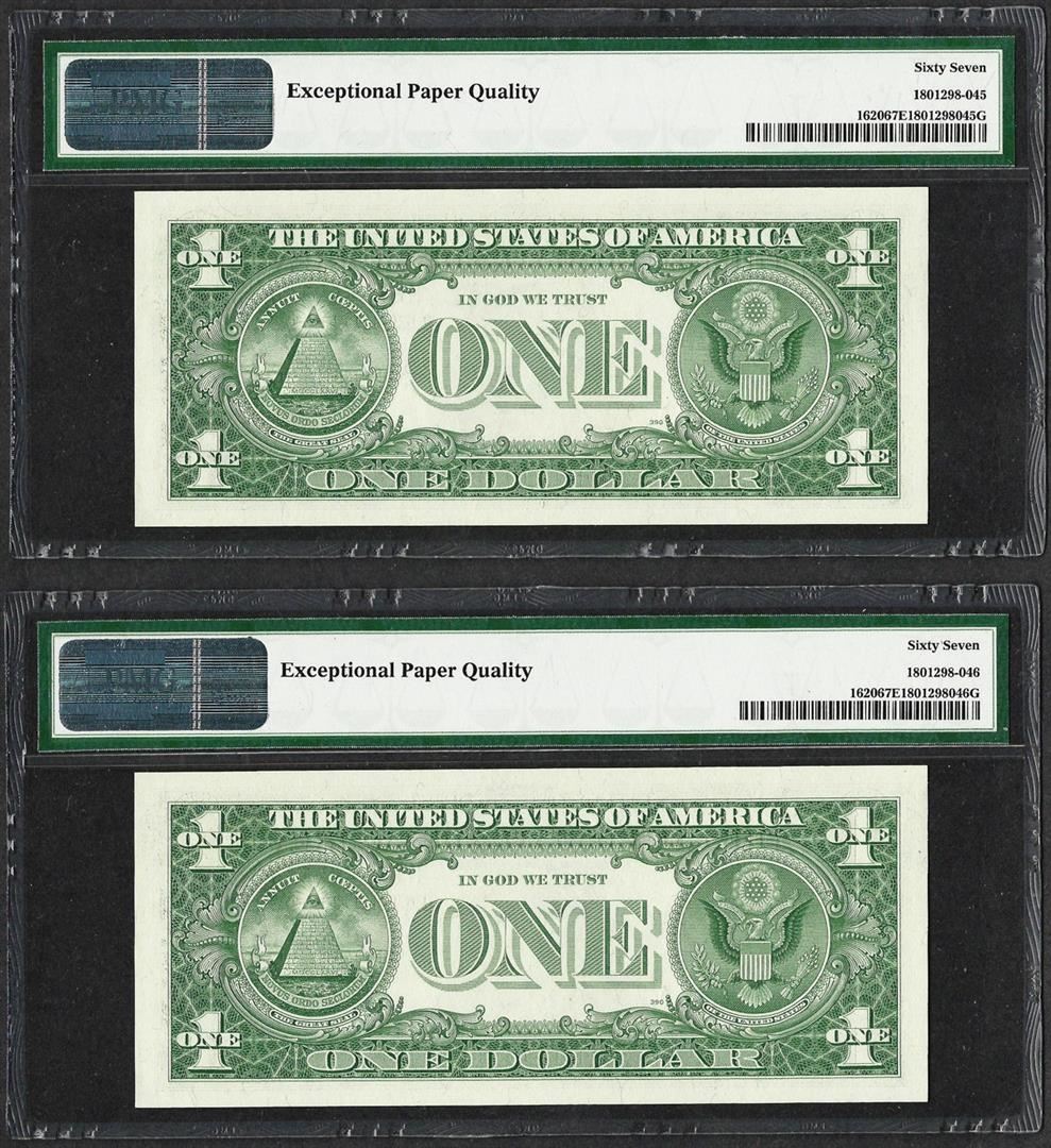 One Lot of (2) Consecutive 1957A $1 Silver Certificate Notes PMG Superb Gem Unc 67EPQ. PMG Appraised.