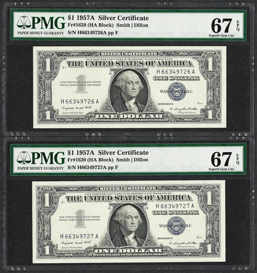 Lot of (2) Consecutive 1957A $1 Silver Certificate Notes PMG Superb Gem Unc 67EP