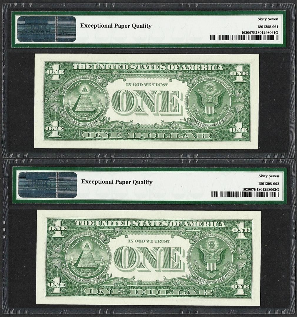 One Lot of (2) Consecutive 1957A $1 Silver Certificate Notes PMG Superb Gem Unc 67EPQ. PMG Certified.