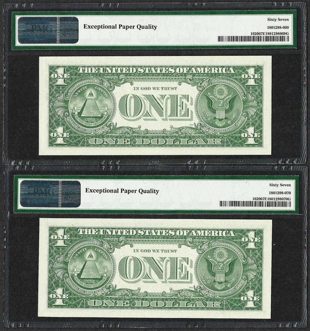 One Lot of (2) Consecutive 1957A $1 Silver Certificate Notes PMG Superb Gem Unc 67EPQ. PMG Appraised.