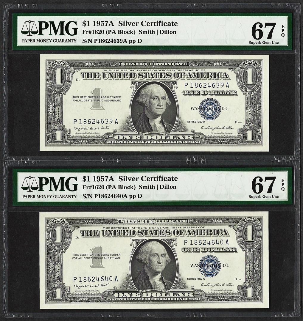 One Lot of (2) Consecutive 1957A $1 Silver Certificate Notes PMG Superb Gem Unc. 67EPQ. PMG Certified.