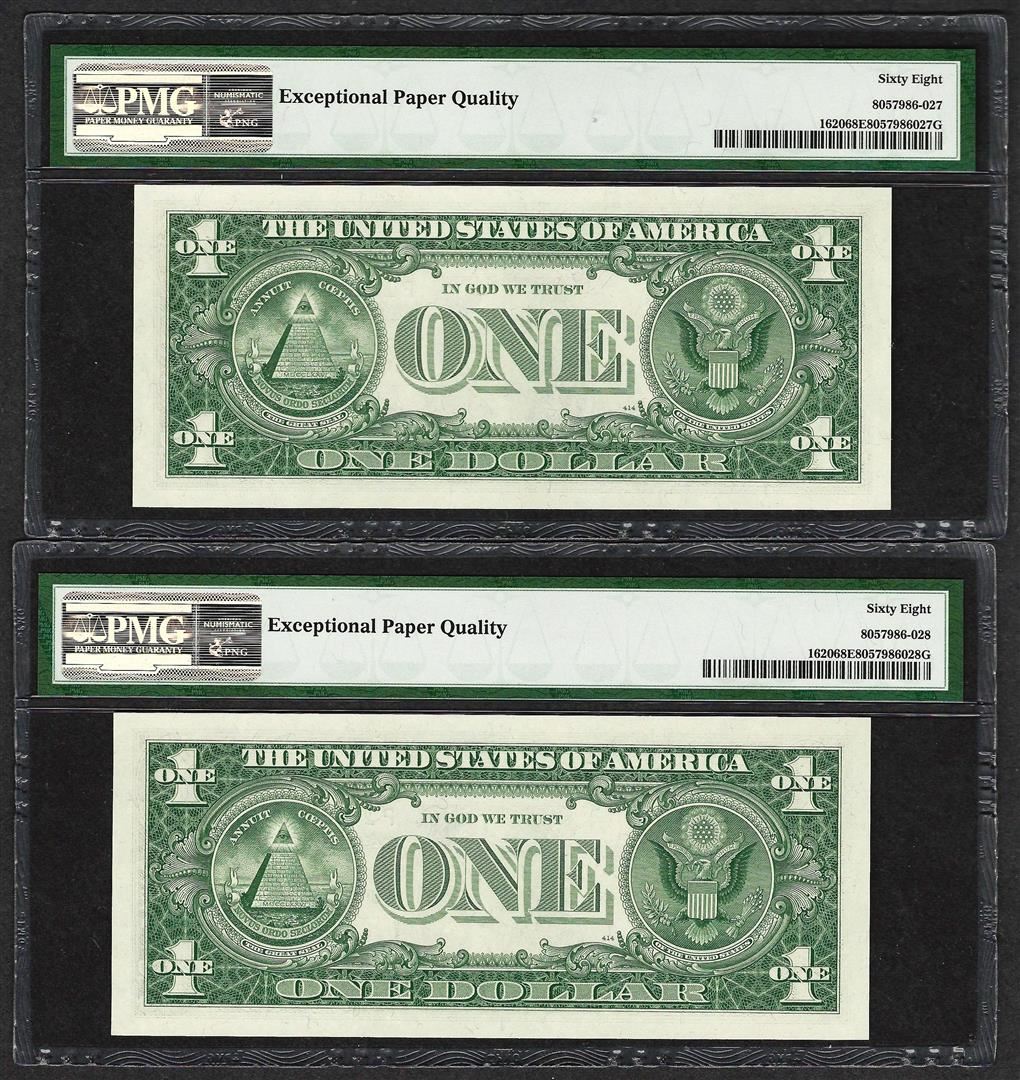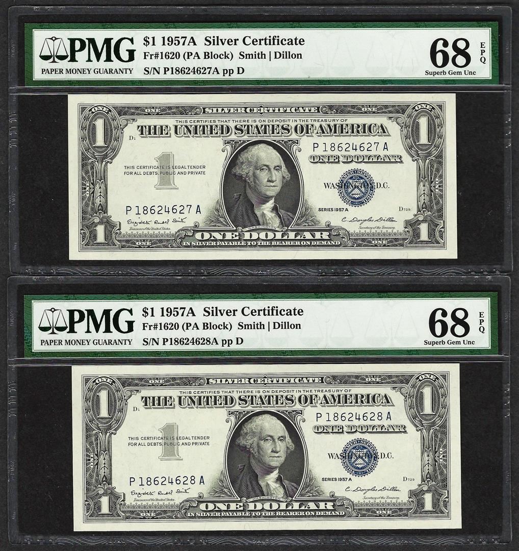 One Lot of (2) Consecutive 1957A $1 Silver Certificate Notes PMG Superb Gem Unc. 68EPQ. PMG Certified.