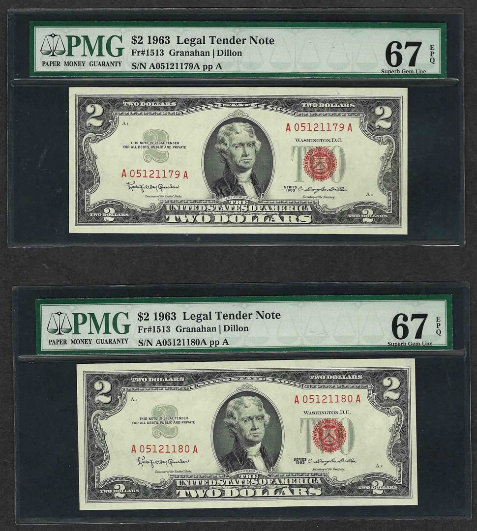 One Lot of (2) Consecutive 1963 $2 Legal Tender Notes PMG Superb Gem Uncirculated 67EPQ. PMG Certified.