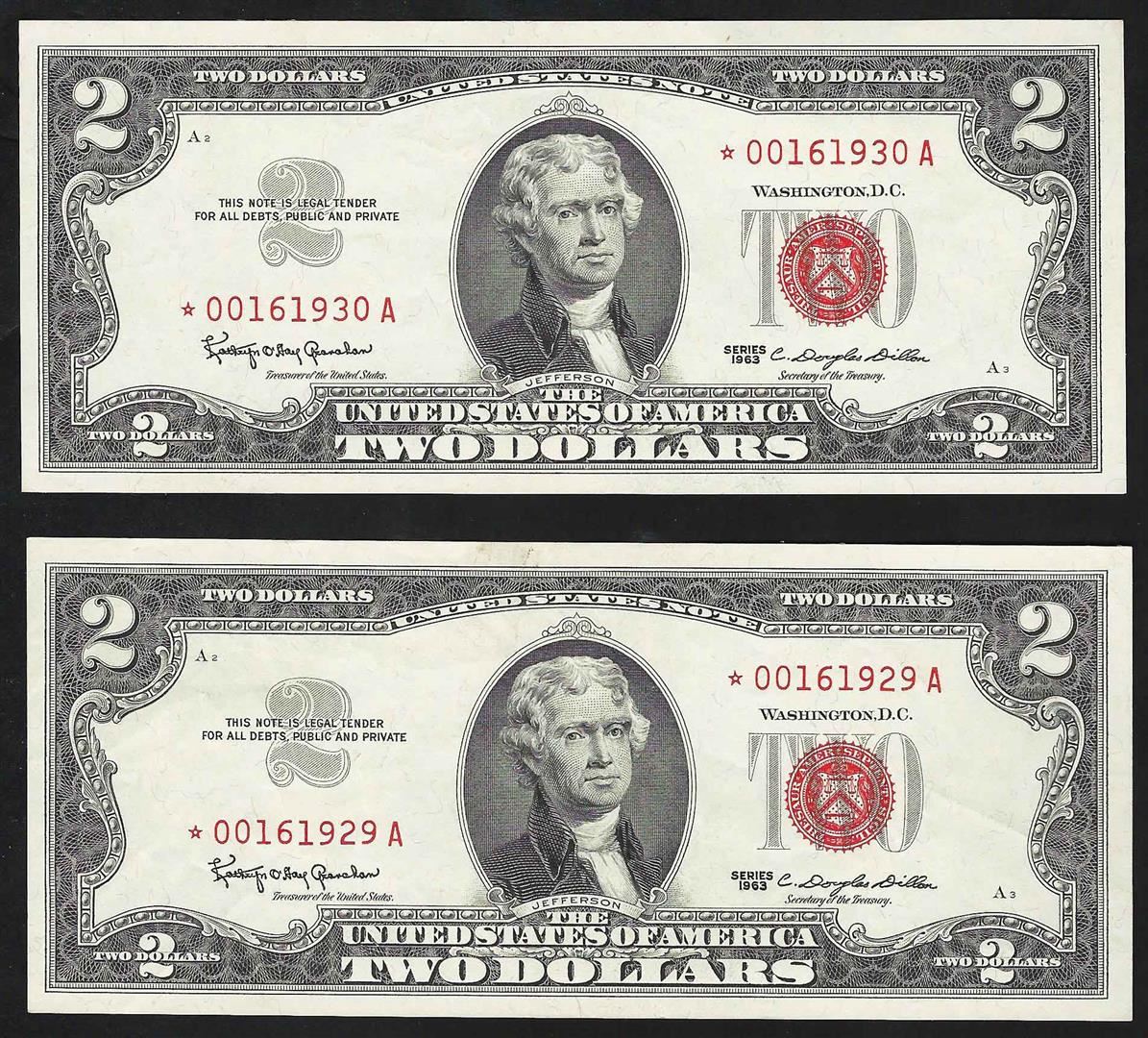 One Lot of (2) Consecutive 1963 $2 Legal Tender Notes.